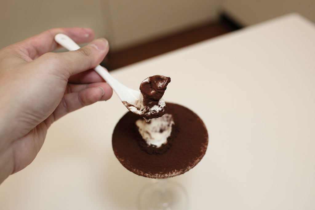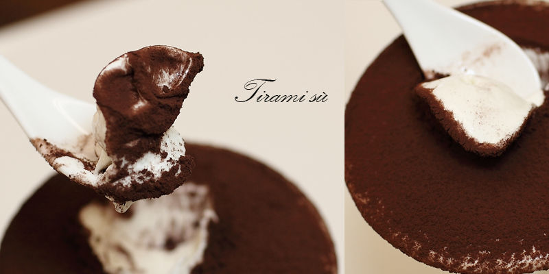 濃縮咖啡、可可、馬士卡邦起士、酒精,這簡直就是完美的組合,傳統的提拉米蘇-可可與咖啡香氣裡,帶著軟嫩起士中的甜酒味,一口吃下鬆軟滑順香溢在口中,好幸福的感覺。若要做成提拉米蘇口味的冰淇淋,一定要掌握同樣的好滋味與口感,更甚者還要超越,這樣的創意才值得被讚許。所以我們以鮮奶來替代奶油降低脂肪含量,一來熱量減少,二來營造出較為清爽不膩;再則我們以義式冰淇淋機特有的空氣混合比例製造鬆軟結構,而不以打發的蛋白及蛋黃打發出的結構,目的是為了不讓蛋黃裡的膽固醇增加身體的負擔。