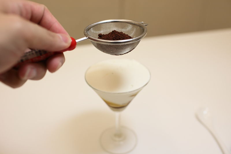 先將1.~5.項攪拌均勻後,投入殺菌鍋,加熱均質後,再製作出冰淇淋,在冰淇淋冷卻的過程中再加入咖啡甜酒。裝盛時先於杯底倒入一些摩卡淋醬,再於最後杯頂,用過篩器裡放上防潮可可粉,拍打過篩器平均覆蓋在冰淇淋上,即可完成。