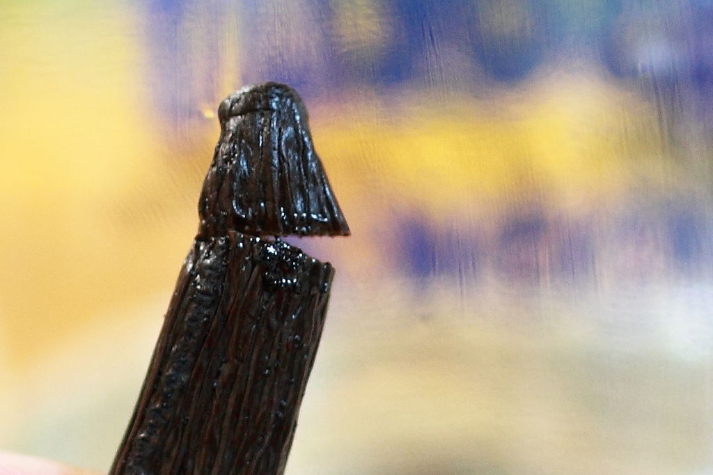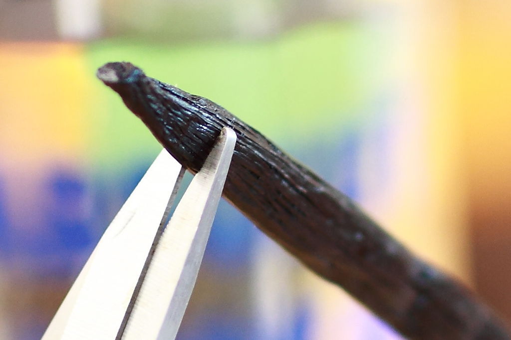 二、將香草莢的尾部剪去一小部分,不要剪斷哦,因為那個小小點一段,也可以拿來泡酒,都有它的貢獻值的,然後每隔一段時間,可以搖晃一下再靜置。這個作法有個小優點,當我們的甜點需要一些香草籽時,可以整支抽起來,然後以擠牙膏的方式,將香草籽取出,剩下的香草莢又可以再泡回去,依然可以使我們的香草精再香濃。整支香草莢都有他的貢獻值。
