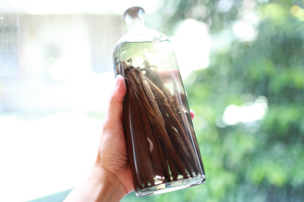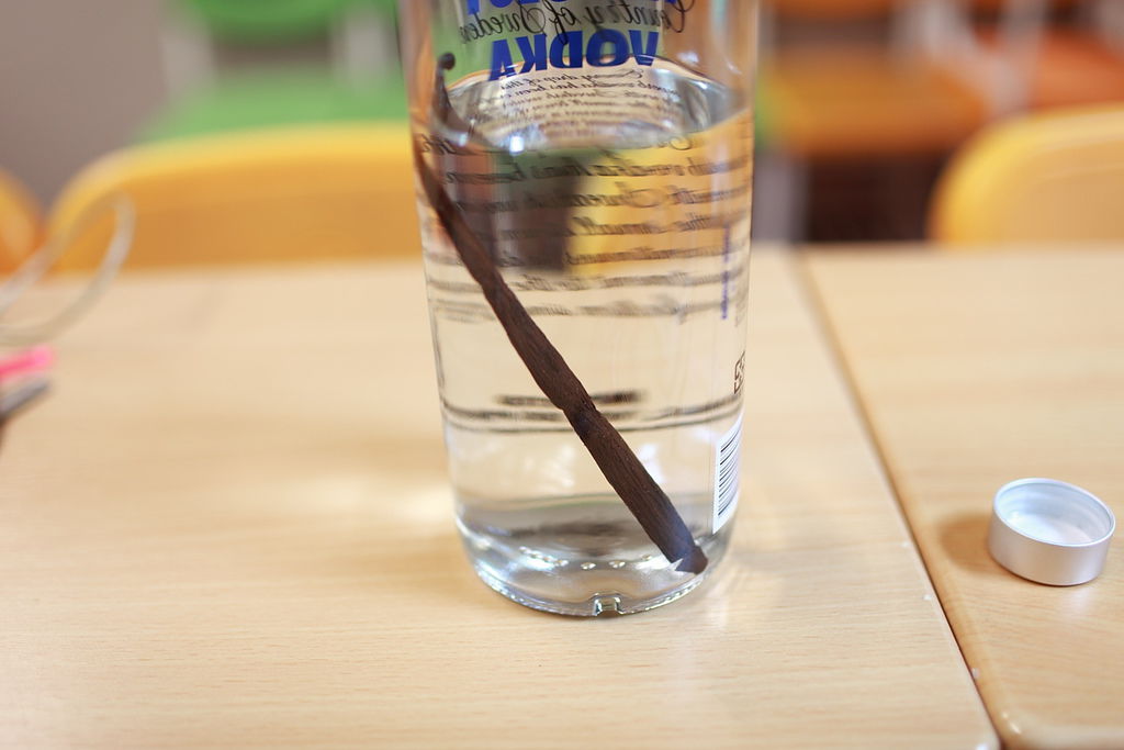 一、準備一瓶酒,最好是高濃度酒精的烈酒。這麼說好了,要將某一物質中的成份取出,是有很多種工法的,但太專業的工法雖然快速,但所取得的代價不是設備昂貴,就是技術性比較高,對一般民眾,這門檻太高了。所以用泡的,比較簡單,但要怎麼泡呢?利用泡的方法以液體作為溶劑,將香草莢裡的物質溶解出來,就是個好方法。但這個溶劑以酒會比水好,酒精作為溶劑更容易將物質萃取出來,所以才會有人拿酒來泡藥材、虎頭蜂或是蛇。