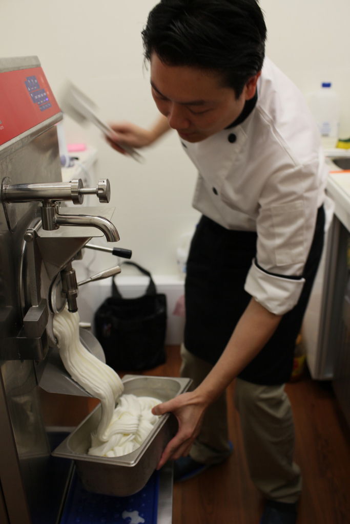 3.老化(又稱熟成):此時材料的溫度為4度,老化的過程時間約為6~8個小時,目的在於純化材料,若有有經過這個階段的時間培養,可能會產生冰晶,造成口感變差,而糖在此時更可純化,使糖類可以完全溶解,甜度就不會太甜,風味更佳。