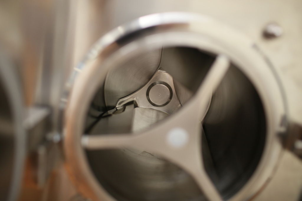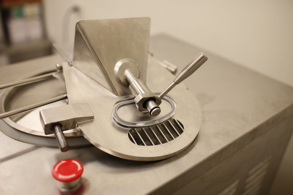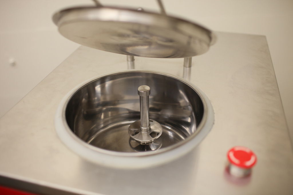 巴士德殺菌缸的內部,可以容納四升的原料,將鮮奶、砂糖、冰淇淋粉與醬料直接投入去加熱到85度C,並有攪拌棒去做均質的混合。