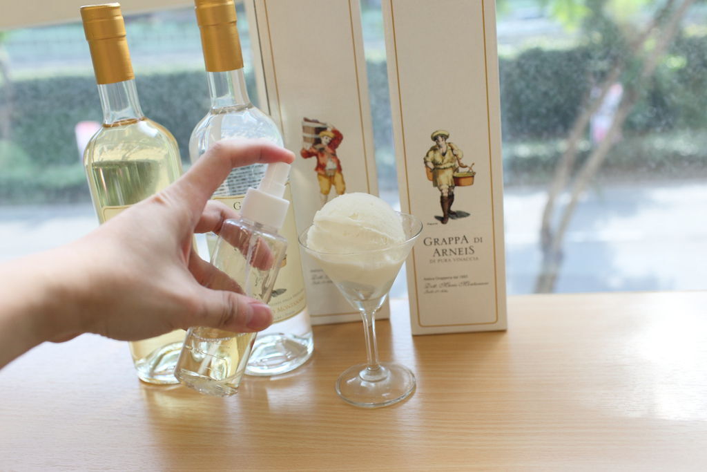 有一次到吳恩文大哥的廚房去做冰淇淋,是做純榛果口味的冰淇淋,他們在吃的時候會淋上一些威士忌,其實我之前還不知道這個吃法,因為我不喝酒的,也不太喜歡酒,但自從那次之後,沒想到威士忌配上榛果還滿好吃的,但那個威士忌本身的味道就比較重,配上濃厚的榛果冰淇淋是很搭,但這次從好朋友Nelson的拿到的義式白蘭地,就不適合拿來配上這榛果冰淇淋。他們的義式威士忌的特色是具有較多的水果或花香氣味的,若配上不適合的冰淇淋口味,反而彼此兩種食材未能發揮出互相加分的功效。