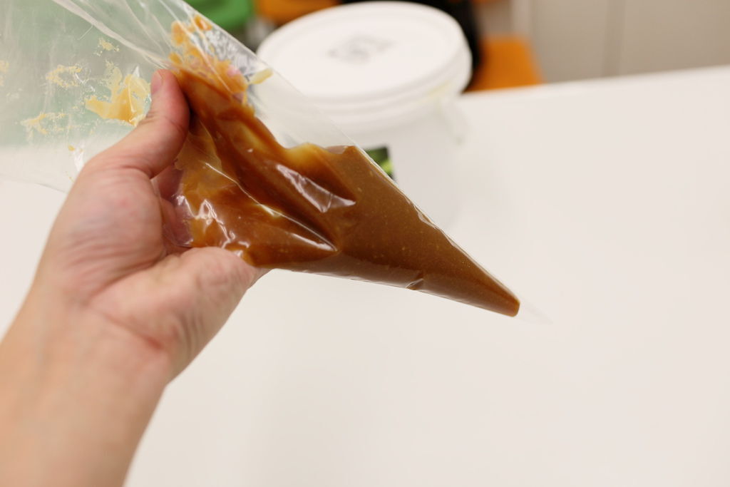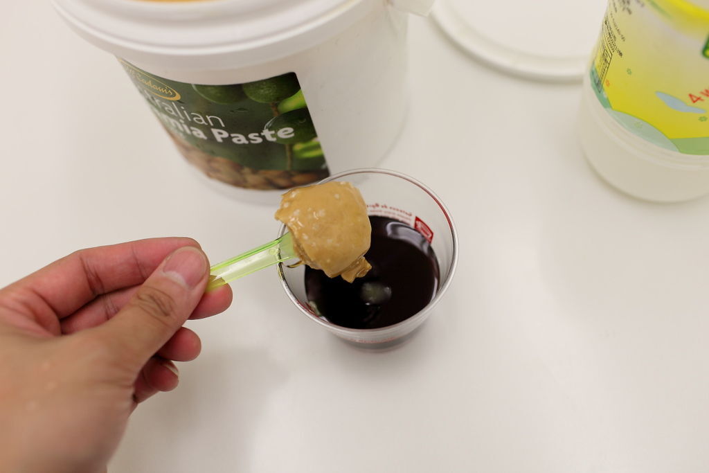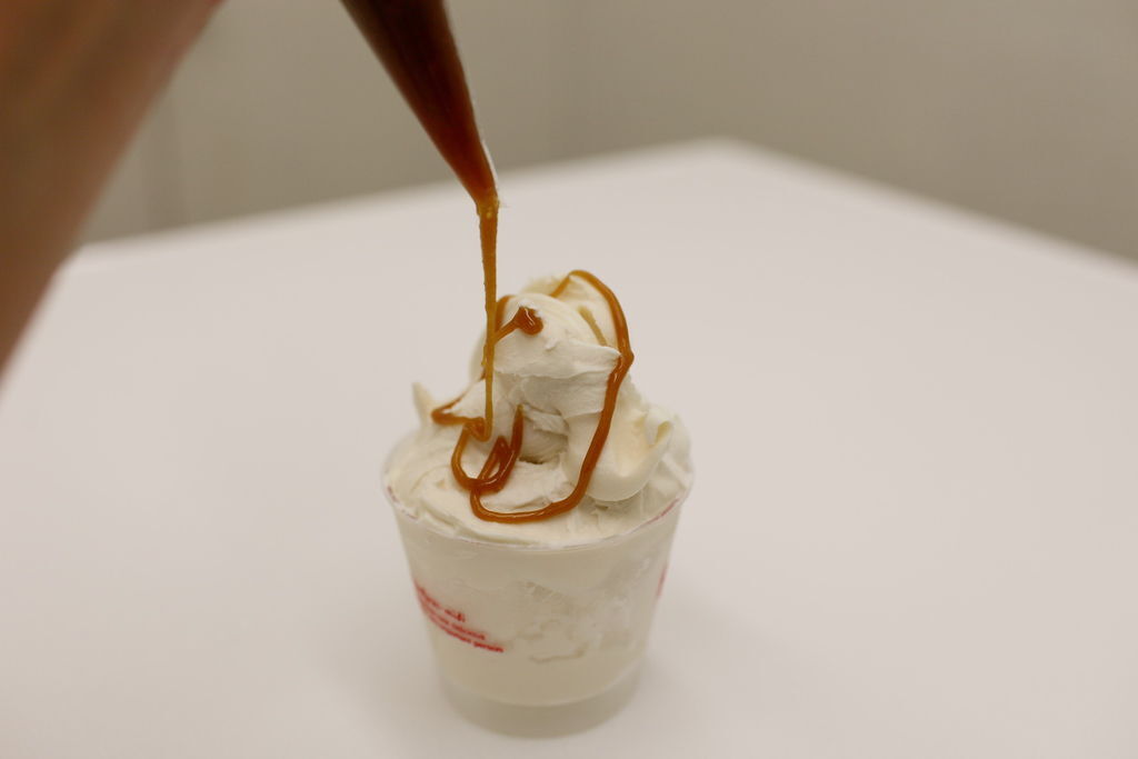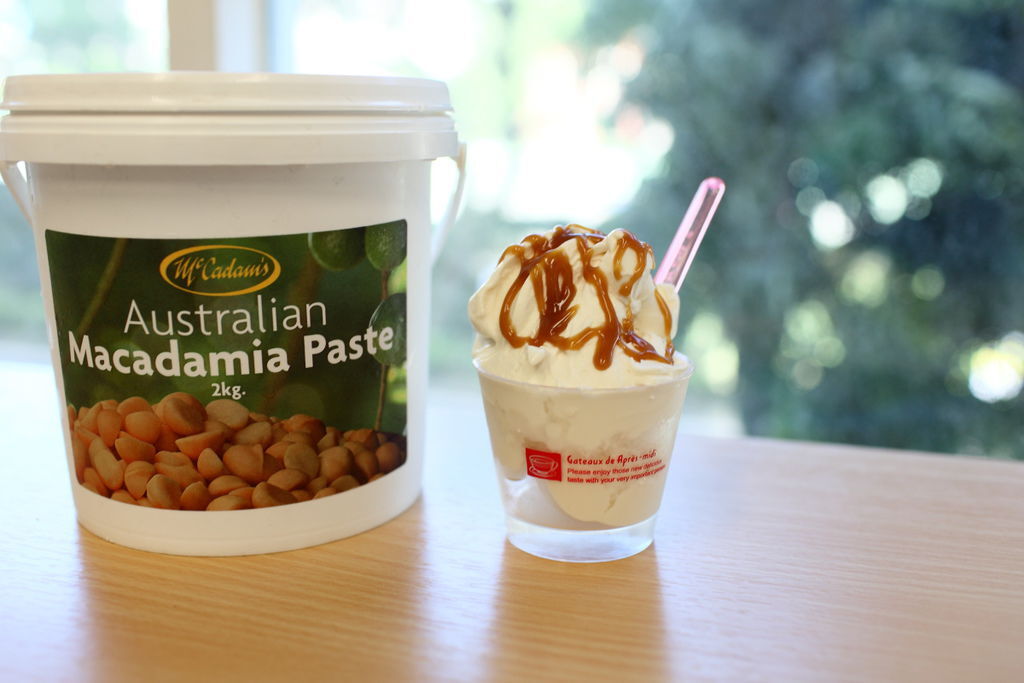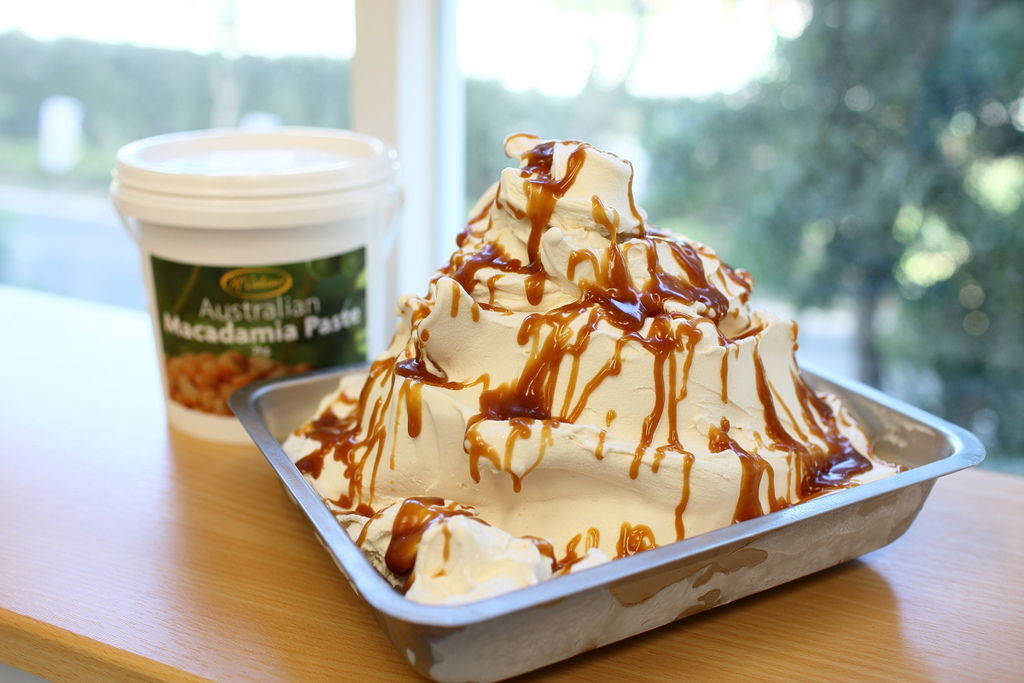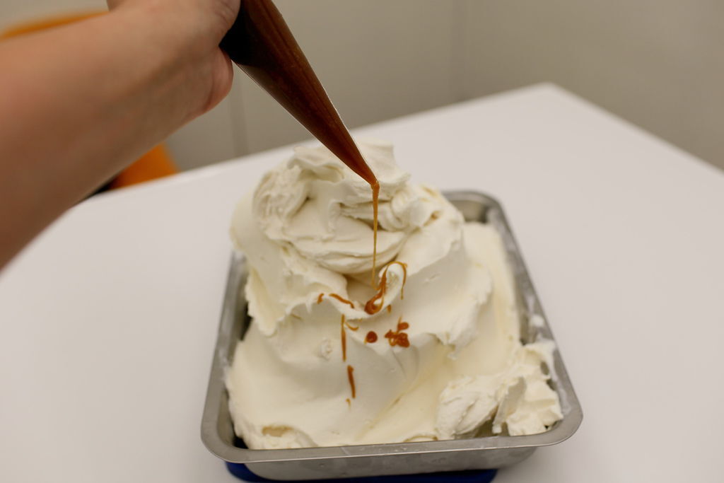有時一點點小小的巧思,是可以增加冰淇淋的風味,也讓冰淇淋更有讓人想大動食指的欲望。我拿了一些焦糖醬,混入一大匙的原料夏威夷豆醬,攪拌後可以當作裝飾淋醬,不僅可以提升冰淇淋風味,更強調夏威夷豆的味道,還可以創造視覺效果。因此,我要再次強調,各種食材都有,也有很多供應商,能不能做出很棒的冰淇淋,全憑廚師個人的想法囉。