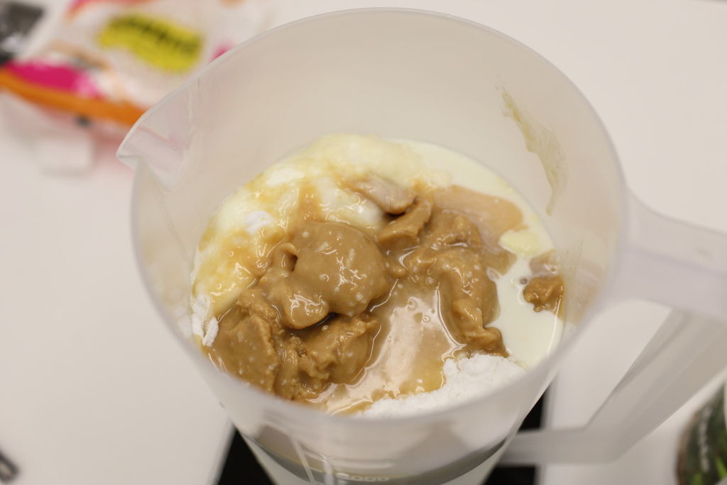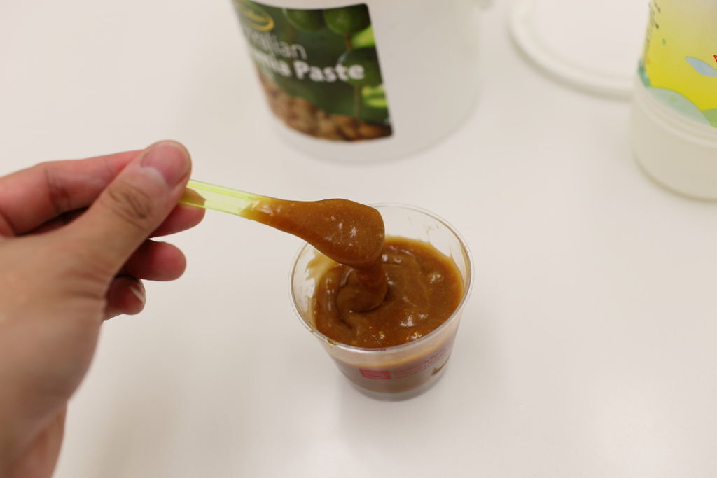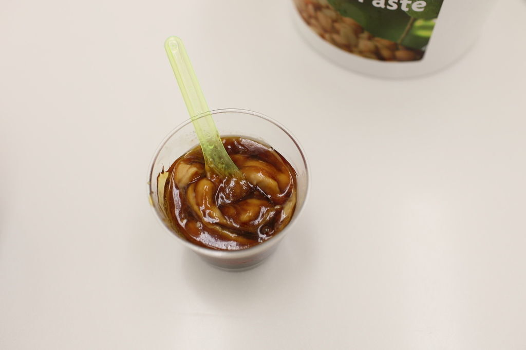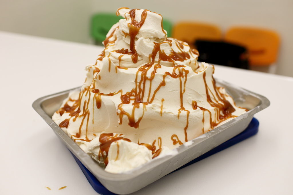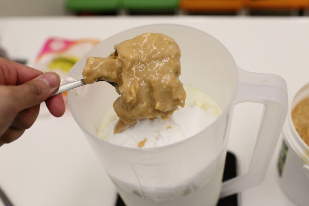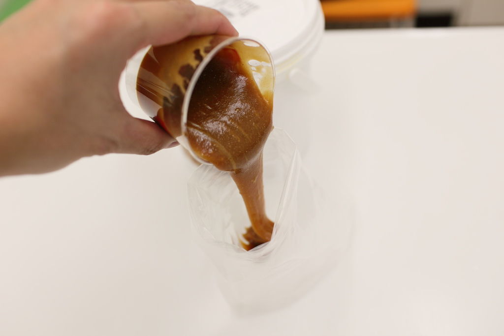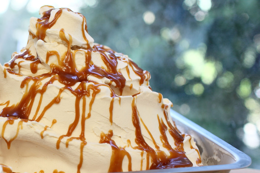 有時一點點小小的巧思,是可以增加冰淇淋的風味,也讓冰淇淋更有讓人想大動食指的欲望。我拿了一些焦糖醬,混入一大匙的原料夏威夷豆醬,攪拌後可以當作裝飾淋醬,不僅可以提升冰淇淋風味,更強調夏威夷豆的味道,還可以創造視覺效果。因此,我要再次強調,各種食材都有,也有很多供應商,能不能做出很棒的冰淇淋,全憑廚師個人的想法囉。