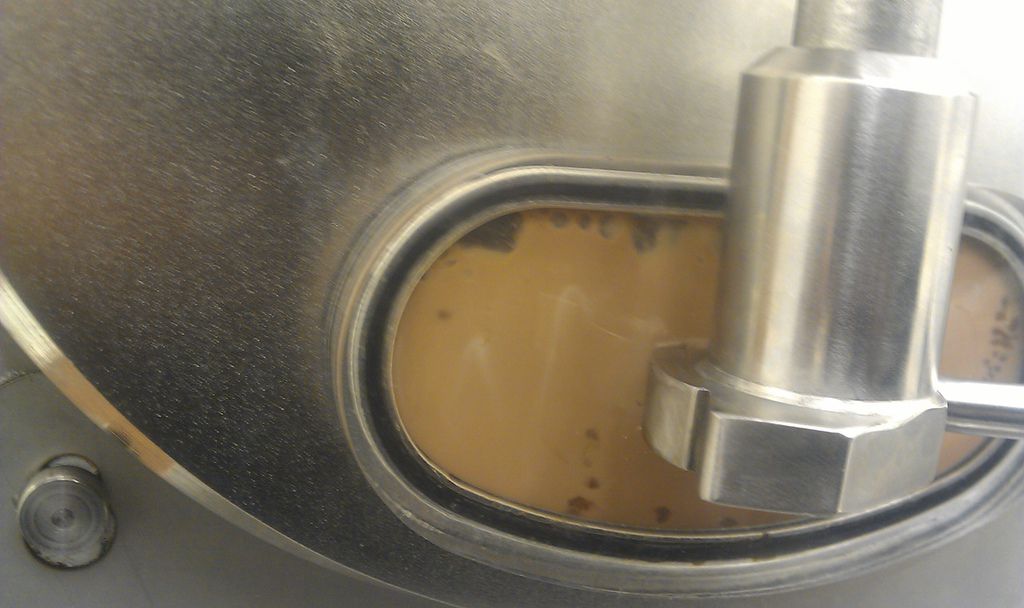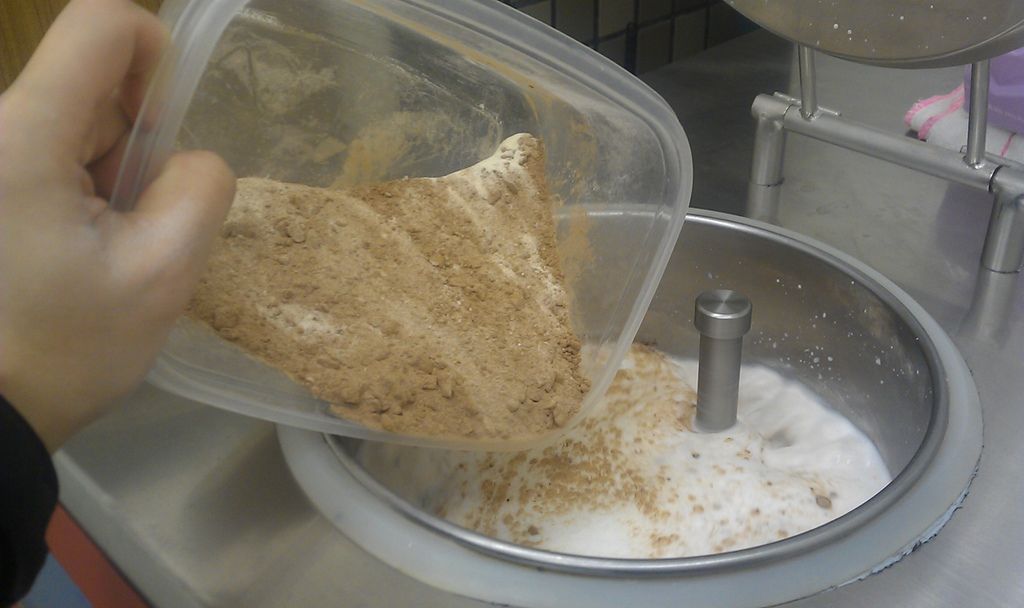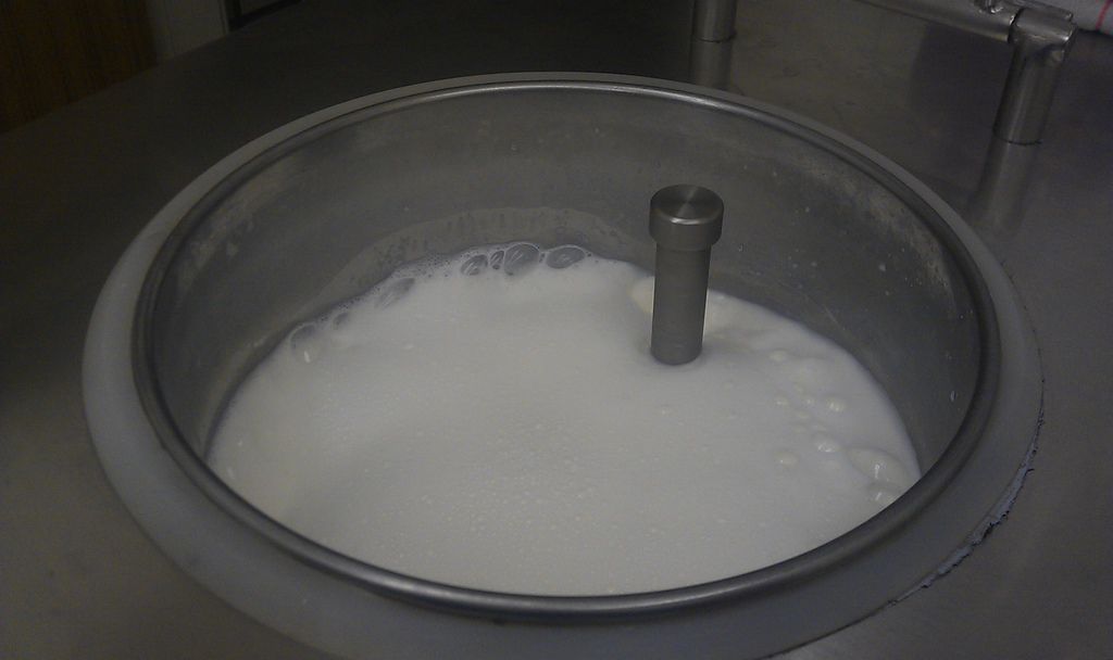 首先、把鮮奶先丟到殺菌鍋裡去煮,先加熱到40℃,然後把預先拌好的基粉、葡萄糖、白細砂糖及可可粉,緩緩地倒入殺菌鍋裡。