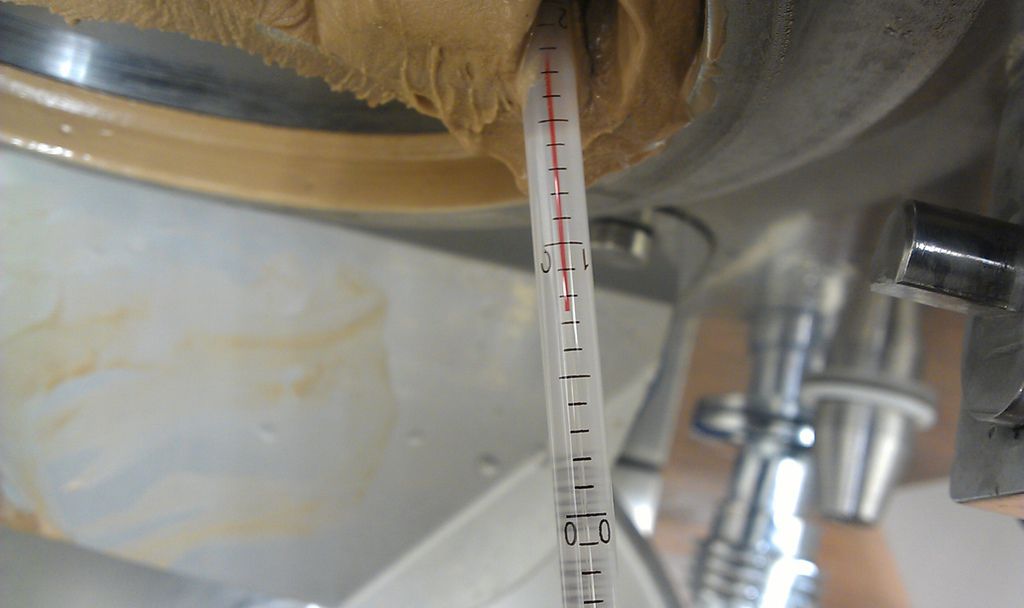 現在我們來測測這個還滿硬的冰淇淋,實際成型的溫度,才-7.5℃,就可以這麼硬了。而我也曾測過可以到-10.5℃,但是幾度和冰淇淋的原料成份比較有關係,所以配方的調整及材料的屬性會因為不同,而成型的溫度也不太一樣。所以大家若要成為冰淇淋達人的話,除了基本的學理要懂外,常常作得到的經驗也是重要的。