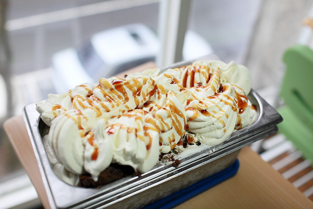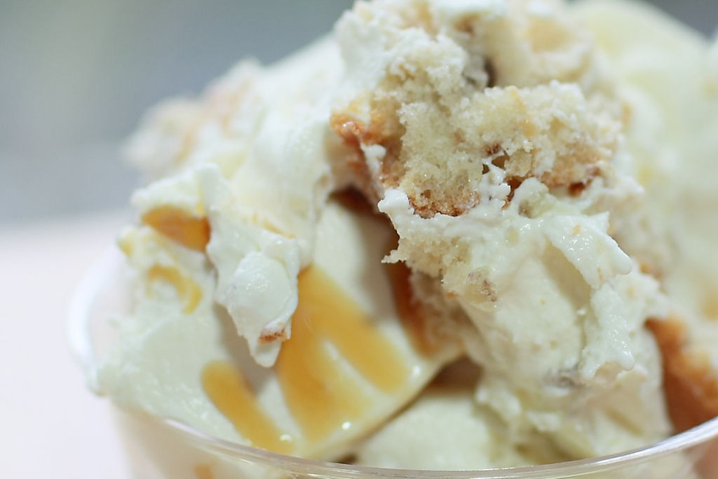 最後我們一層香蕉冰淇淋,一層馬芬蛋榚,層層交疊,再淋上焦糖淋醬,就大功完成了。
