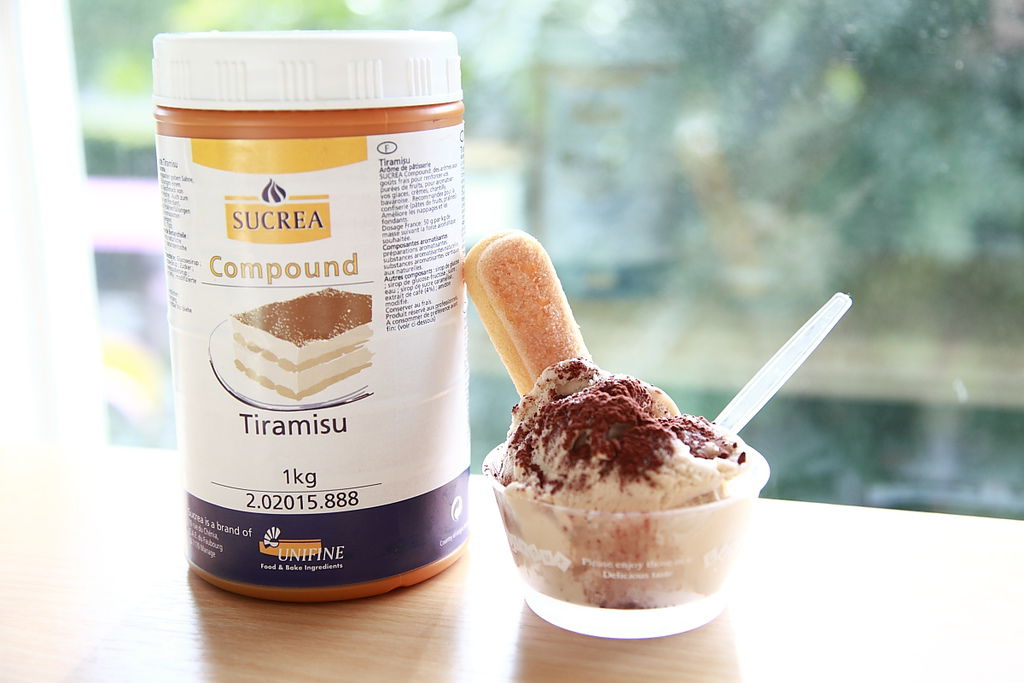 二、基本的配比例要正確。我以這個口味的冰淇淋來說好了,一公升的鮮奶+50克葡萄糖+100克牛奶底冰淇淋粉+50克的堤拉米蘇口味的濃縮醬+100克的白細砂糖。也就是基本比例就是一公升的鮮奶就是配50克葡萄糖、100克冰淇淋粉,至於濃縮醬要多少,罐上都有寫參考的建議比例,像這款口味就是以一公斤的原料配上50克的濃縮醬料,至於白細砂糖要加多少就看自己本身要賦予這個冰淇淋有多甜了。基本上,在調味的時候,所放糖的比例要稍稍甜一點,因為冰淇淋會混入空氣,而且變成冰時也比較不甜,所以您覺得正常的甜度,變成冰淇淋時差不多就要打七、八折了。