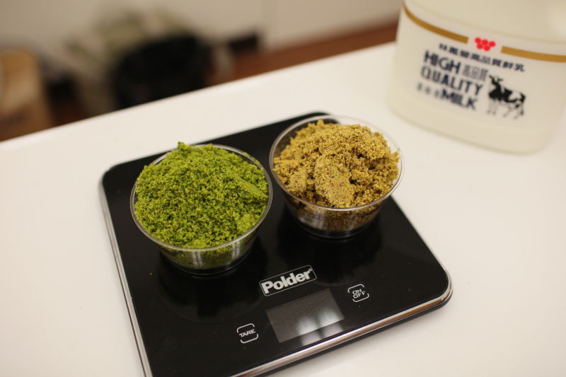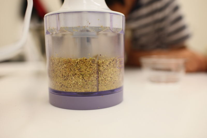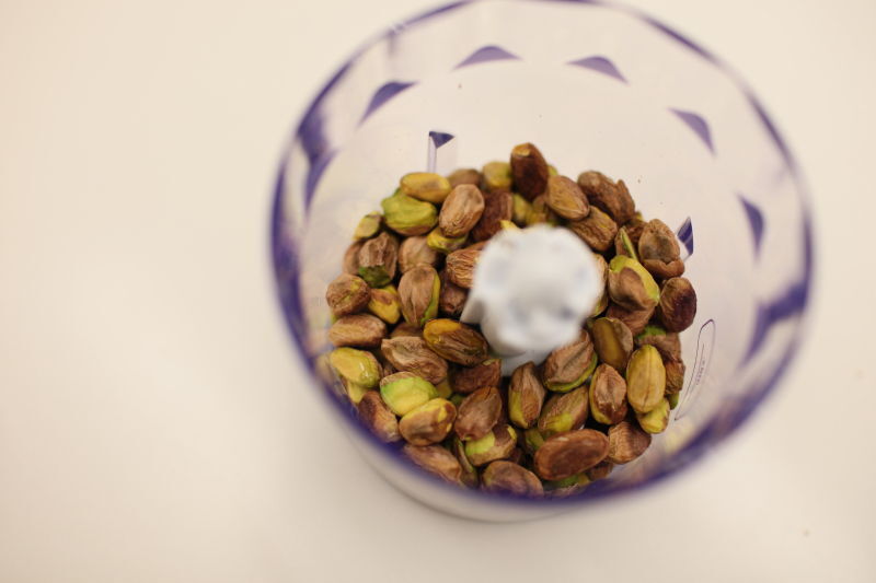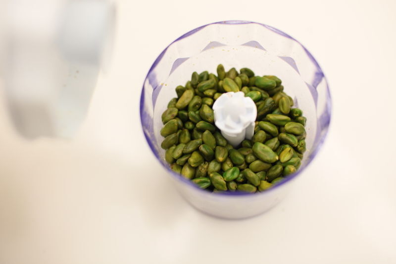 再用小火拌炒過的綠皮開心果仁打碎後,將兩者混於一起