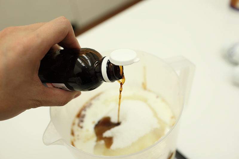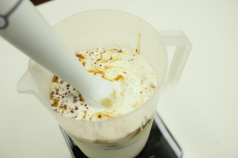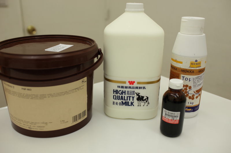 先將1.~6.項攪拌均勻後,投入殺菌鍋,加熱均質後,再製作出冰淇淋。裝盛時先於杯底倒入一些摩卡淋醬,再於最後杯頂,交錯淋上淋醬。