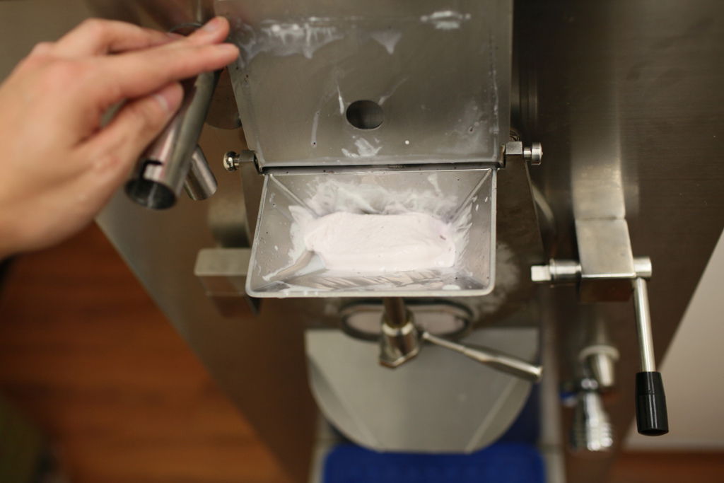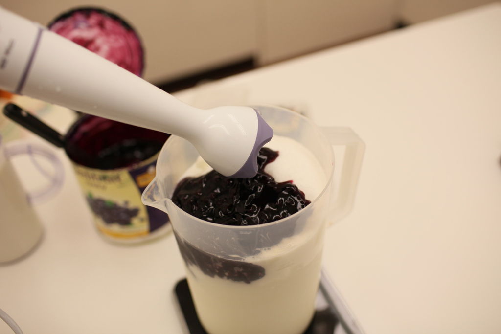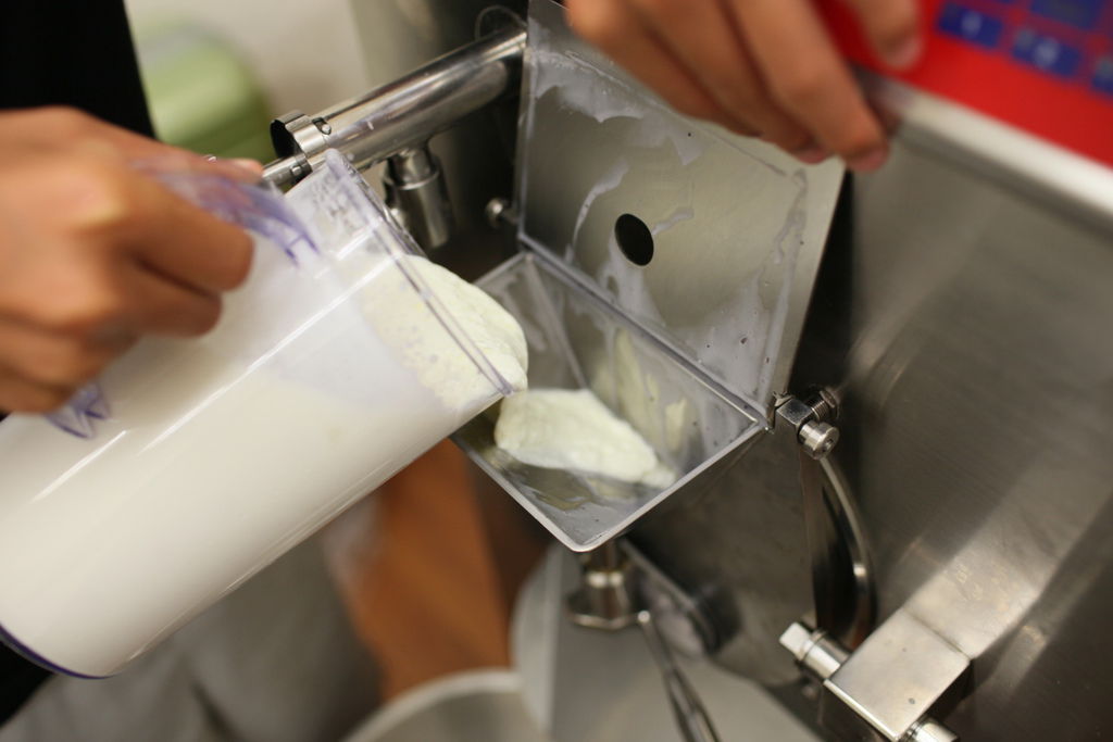 將先前取出混合的優格,與加熱殺菌後的基底,一同加入製作冰淇淋。