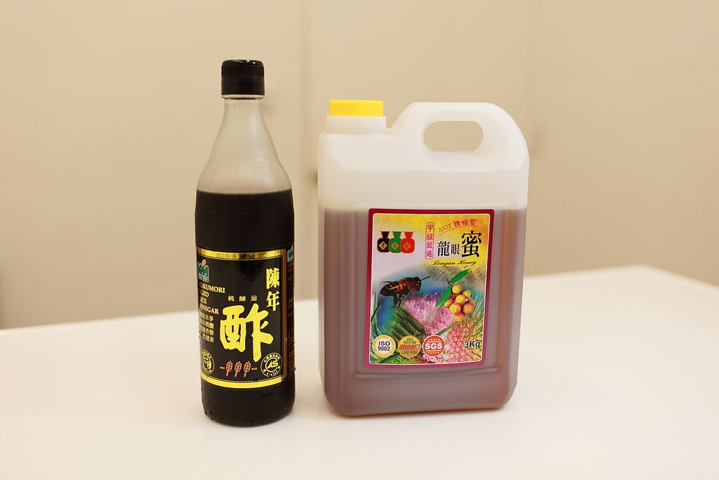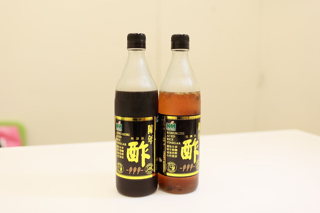 看看照片上的就是朋友釀了三年的水果醋,基底都是穀盛的米醋,左邊加的是乾燥過的洛神花與冰糖,右邊加的是乾燥後的菊花與冰糖。第一次直接喝原液有點不太習慣,有點點微嗆微辣,但很快就順口了,慢慢就能感受到醋味的美妙,但想想一口氣就要用掉一瓶來做冰淇淋還真覺得好可惜哦。