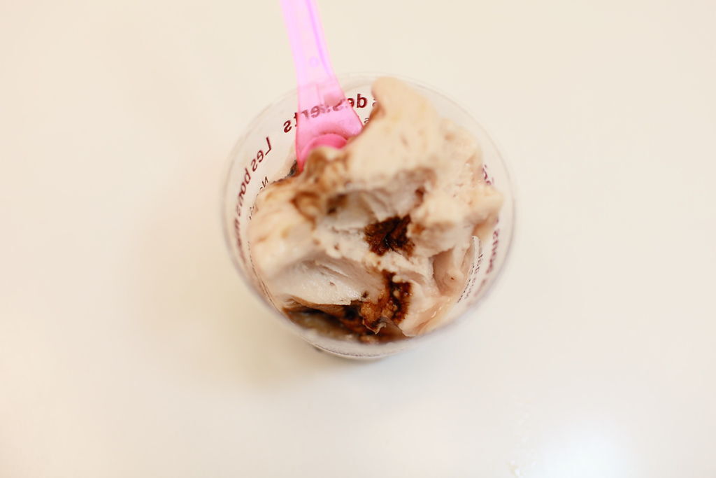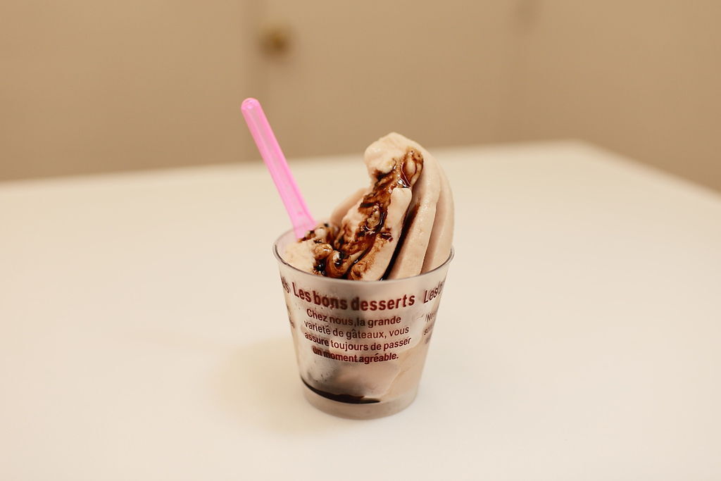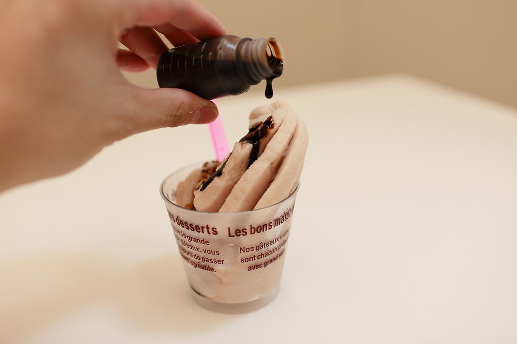 這時放在我這裡快一年的甜醋終於可以拿出來用了(那是之前做大人口味的巧克力冰淇淋的同學送我的),淋一點點在這個冰淇淋上,真是風味好到不行,沒想到醋這麼東西怎麼會這麼好吃呢?可以做冰淇淋耶~~~原本在我的認知裡,只有在吃肉焿麵和蚵仔麵線時,我才會加一點,真是很有趣的食材。