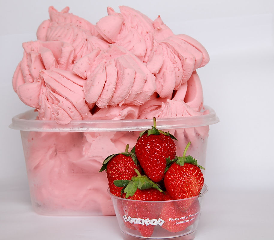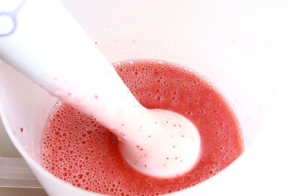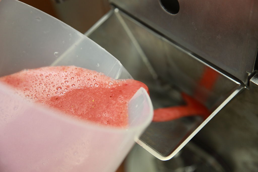 要吃到真正的草莓冰淇淋,就是要像照片中的做法,就是豐富使用新鮮草莓,不加牛奶,做完全零脂的雪酪,才能倍嚐到台灣水果的美味。