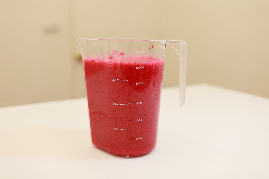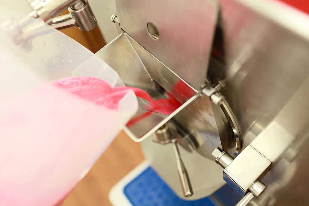 再來剛磨出來的汁是超黏的又一堆泡泡,所以一定要再拿去熬煮,很快地那些汁就沒有泡泡了,也不黏。最後會變成很濃縮的原液,有了這個濃縮液就可以很好應用,泡茶、做雪酪或做淋醬等應用更廣,而保存期限又可以更長。