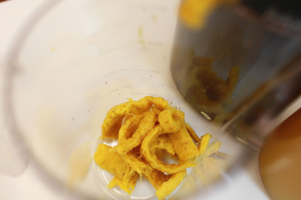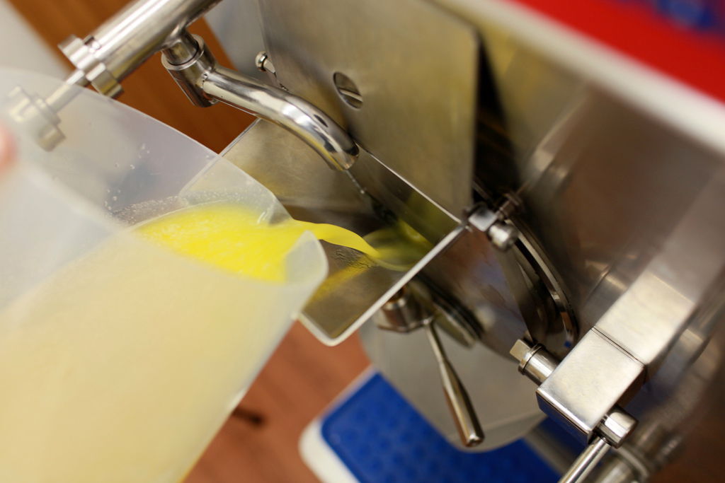 若讀者有看過我之前所過的文章,在製做冰淇淋時,最難的就是要把水果的味道及香氣完全保留下來,這樣做出的冰淇淋才有著很水果的滋味。一般的榨汁機以鋼刀方式打碎果肉,雖然可以打得很細,但就是打得太細了,破壞了水果的分子結構,讓味道與香氣分離,做出來的冰淇淋,滋味就是差了點。但用慢磨的方式,水果的果汁裡有著比較完整的分子,除了味道好外,水果的原色比較能夠保留,做出來的冰淇淋,不加人工色素,依然漂亮而賣相好。在此我還是堅持「好看的水果,一定就是好吃」的外貌協會想法。