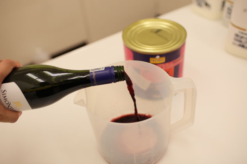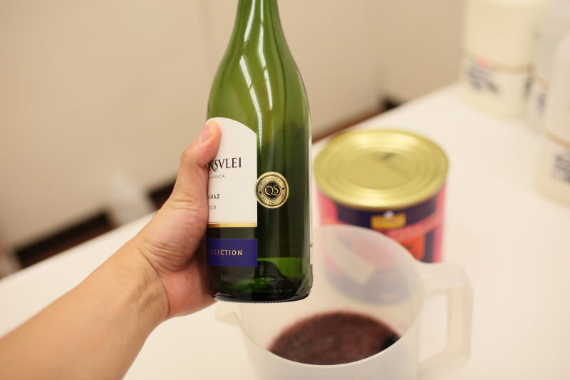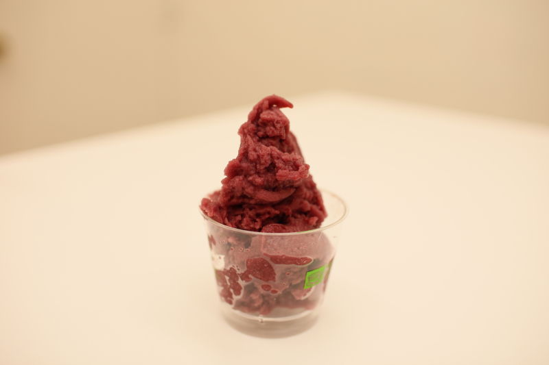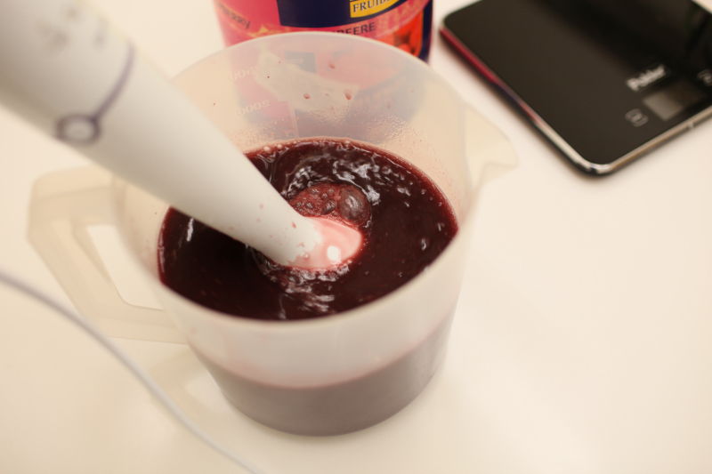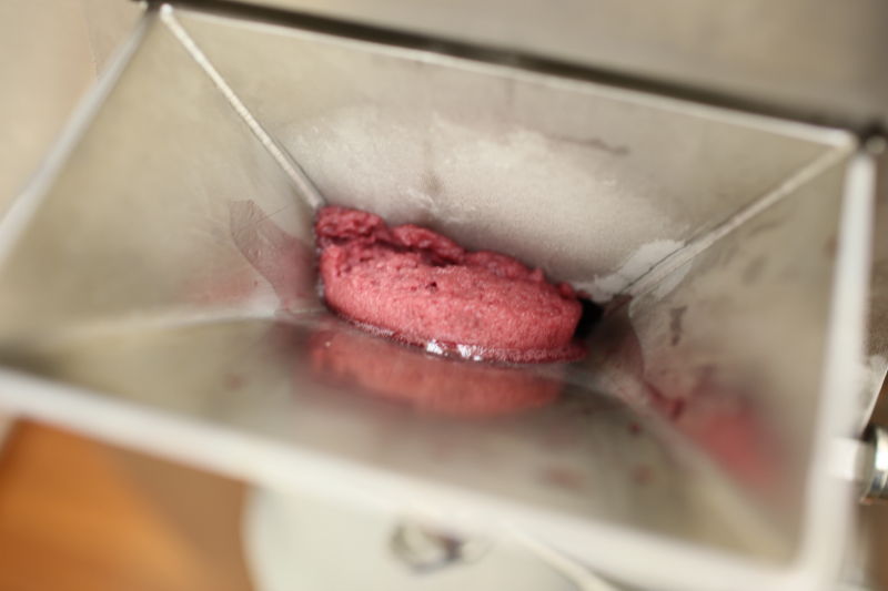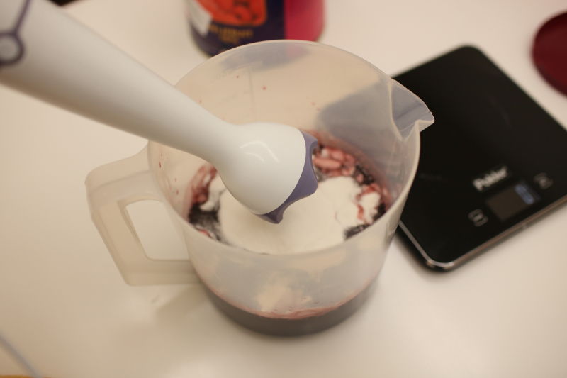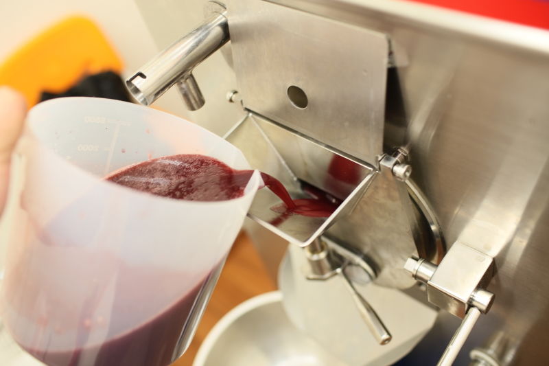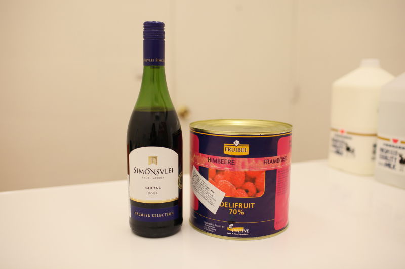 一樣的,加入水果底冰淇淋粉、葡萄糖、白糖、覆盆子及紅酒,以攪拌棒打均勻投入製冰機裡,製作出義式冰淇淋。
