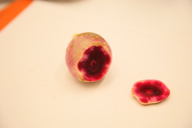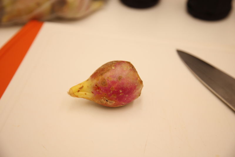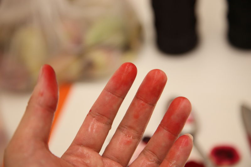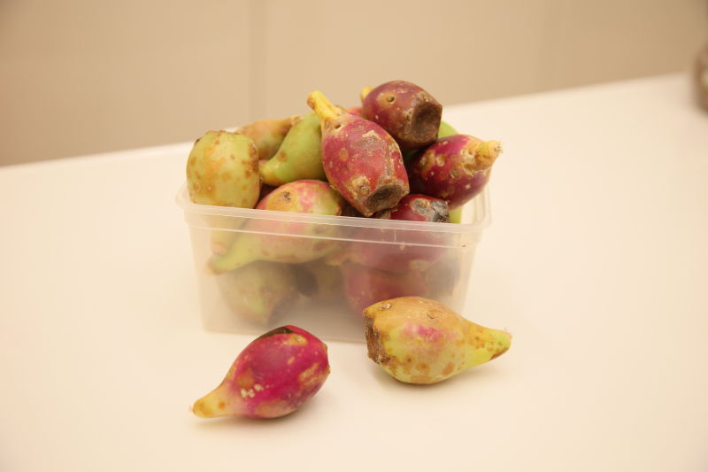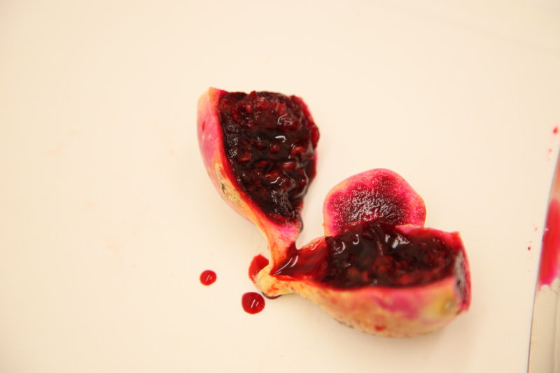 首先切掉末端的蒂頭,剖開一半,就可以看到鮮紅的果肉及顆粒狀的硬籽,不過這裡特別要提醒大家注意一下,在處理仙人掌的果肉時,要小心內部有一個尖刺的籽,這是仙人掌人特有的結構,千萬不能讓它被人家吃下肚,否則就麻煩了。最好是處理完的果肉,還是拿去過濾一下,是最安全的。